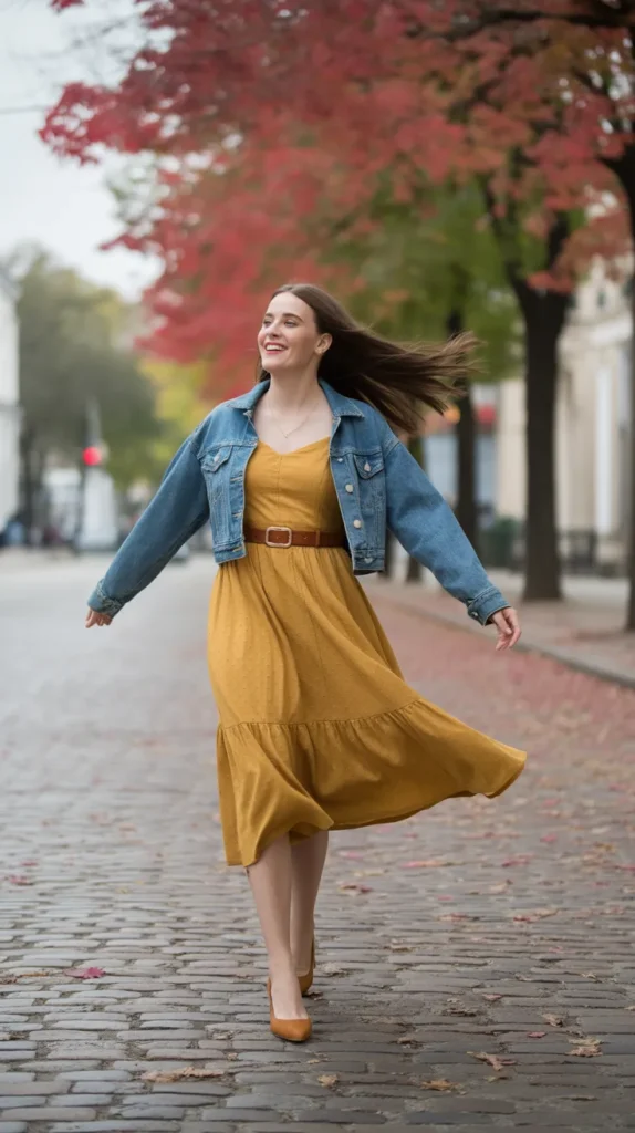 When you want something bold yet approachable, a deep mustard midi dress is the answer. π» The rich golden hue screams fall and gives your autumn style an instant seasonal glow. Cinch it with a brown leather belt to define the waist and layer with a cropped denim jacket for a relaxed balance. Knee-high boots complete the look, making it both stylish and practical for chilly days. The midi length feels polished enough for dinners but comfy enough for casual weekends. Mustard is also a color that flatters many skin tones, making it a safe yet standout choice. Add a crossbody or tote bag in a complementary tone to tie it all together. This look blends girl next door style with a playful edge, proving 2025 autumn outfits can be bold and chic at once.