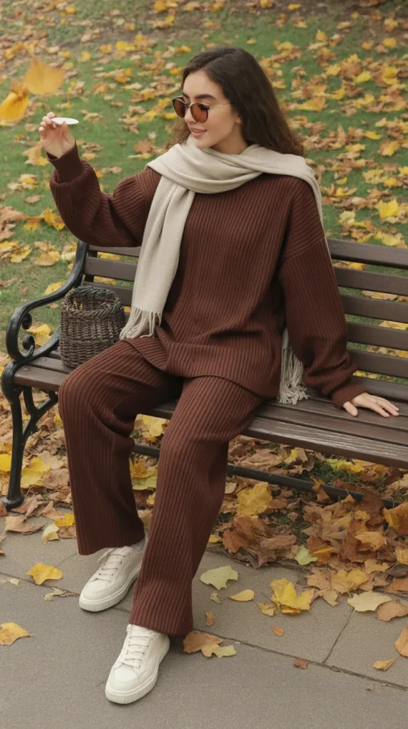 Matching sets are having their moment, and a chocolate-brown knit duo is the ultimate cozy pick. π« A ribbed knit top with matching trousers feels stylish but comfortable, perfect for lounging or stepping out. Add a cream scarf for contrast and sneakers to keep it laid-back. This outfit showcases how 2025 autumn outfits can look put-together with very little effort. The deep brown shade reflects the warmth of fall while still being versatile enough to style with neutrals or metallic accessories. Whether youβre working from home or heading out for errands, this look nails the cozy chic balance. Itβs approachable, comfortable, and undeniably stylish. Add a tote bag and youβre ready to conquer the day with girl next door style charm.