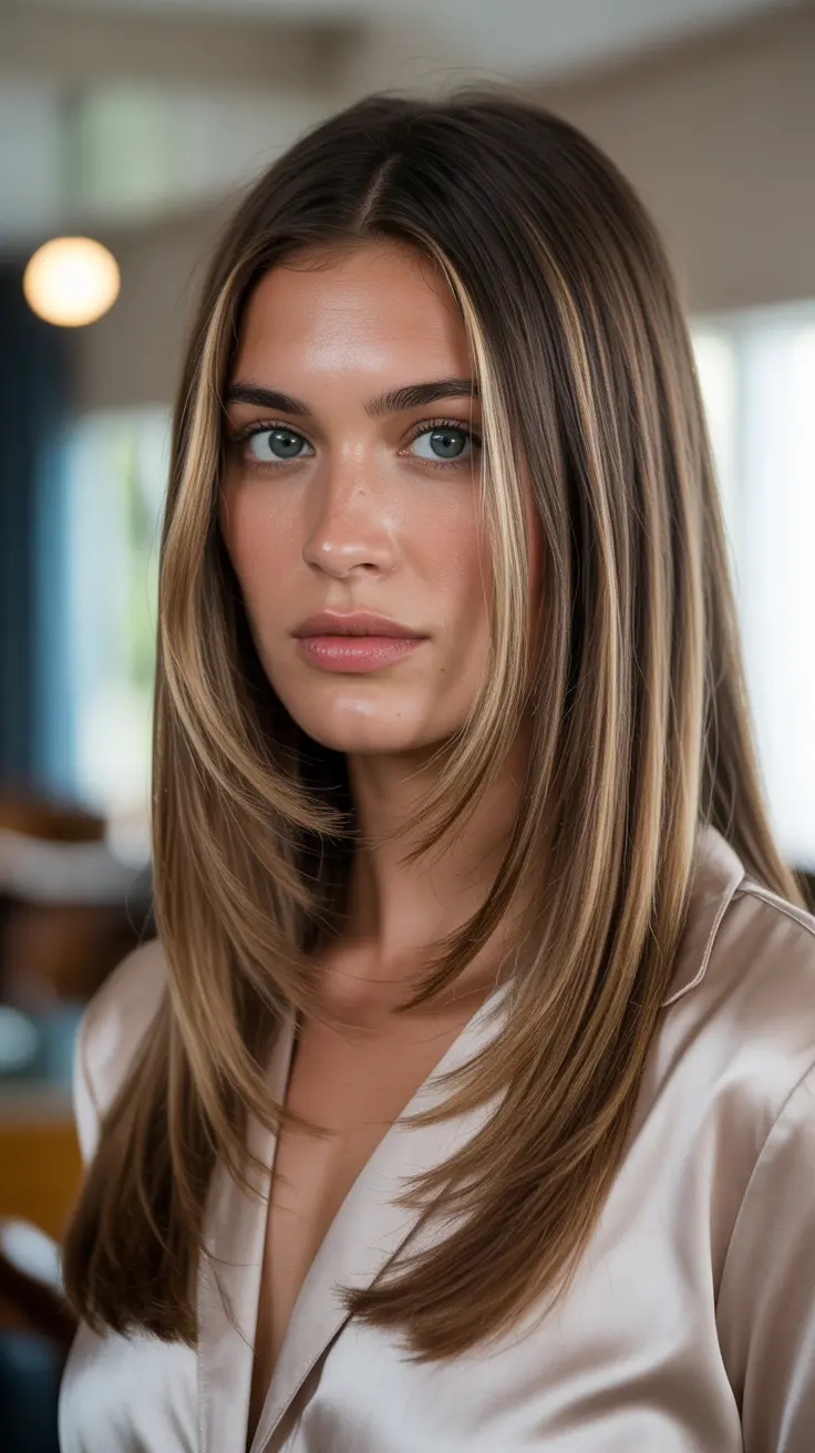 The image showcases a stunning example of this hairstyle. The straight layers fall gracefully, framing the face beautifully. The highlights add depth and dimension, catching the light in a way that enhances the overall look.