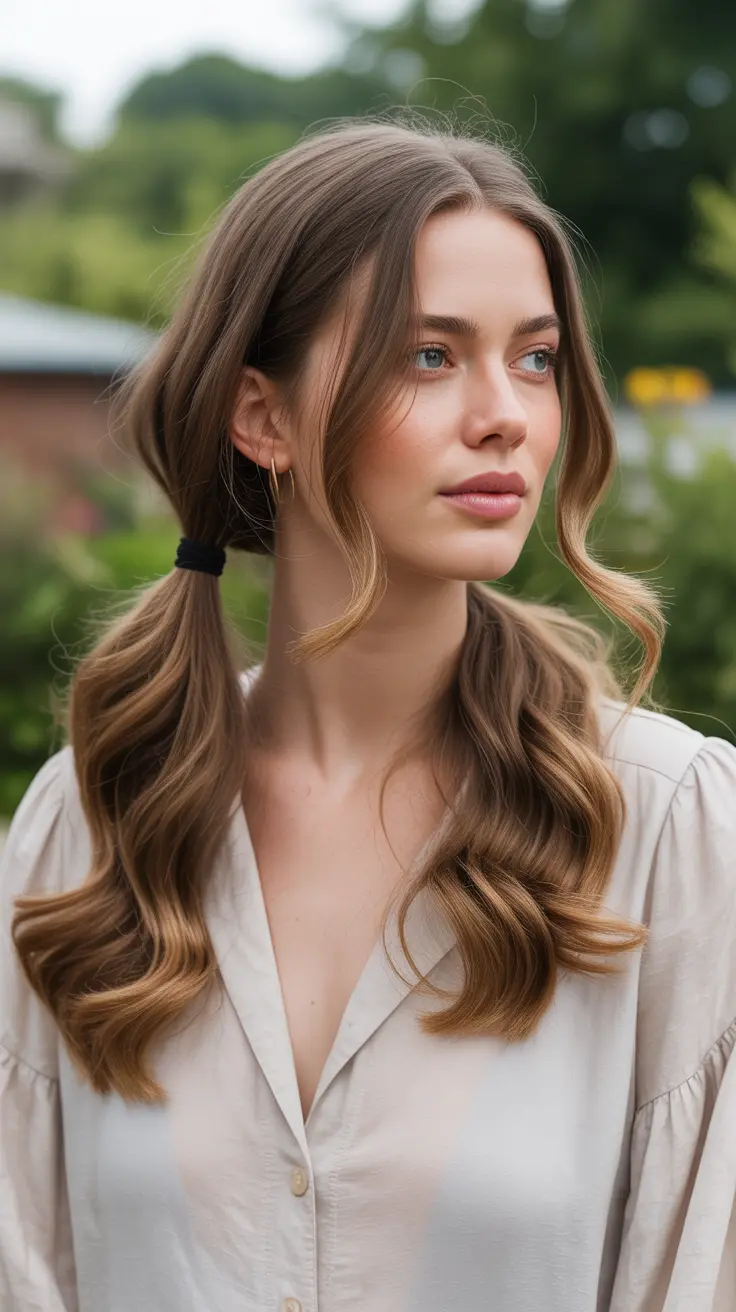 The image shows a beautiful blend of soft curls cascading down from the ponytail. The hair is tied back with a simple hair tie, allowing the waves to flow freely. This look is great for those who want to keep their hair out of their face while still showcasing those lovely layers.