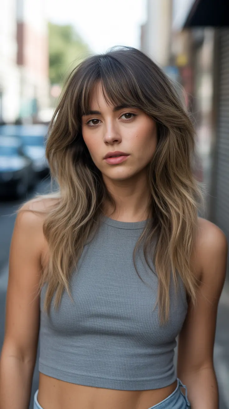 Feathered layers with bangs are a classic look that brings back the iconic volume of the ’90s long layered hair. This style features soft, wispy layers that create movement and texture, making it perfect for anyone looking to add some flair to their hair.