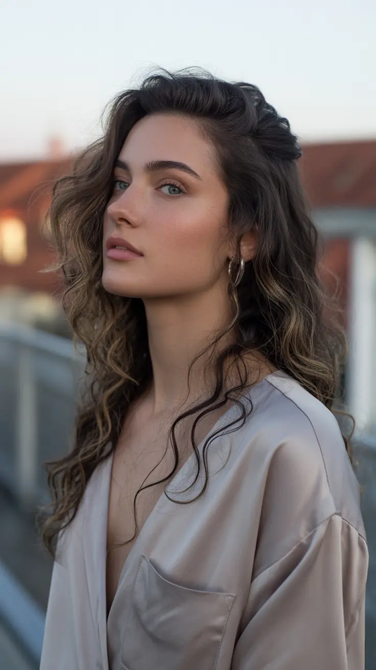 The image showcases beautiful, flowing waves that frame the face nicely. The subtle highlights enhance the layers, giving depth and dimension. This hairstyle is versatile; you can wear it casually or dress it up for a night out.