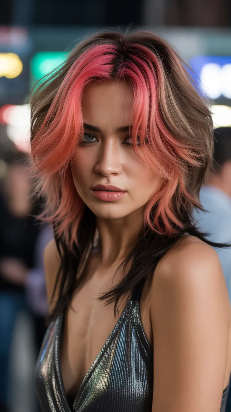 The bright hair color in this look really stands out. With vibrant pink and yellow hues, it captures the bold spirit of the ’90s. This combination not only adds personality but also highlights the layers beautifully. The contrast between the colors makes the choppy layers pop, giving a fresh twist to a classic style.