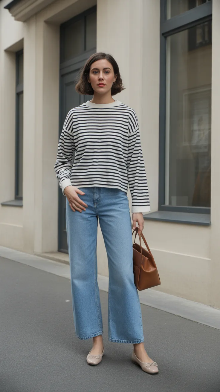 Mom jeans paired with a striped cropped sweater create a fun and relaxed look. This outfit is perfect for casual style outfits that still look chic. It’s an easy choice for anyone wanting to stay stylish without too much effort.