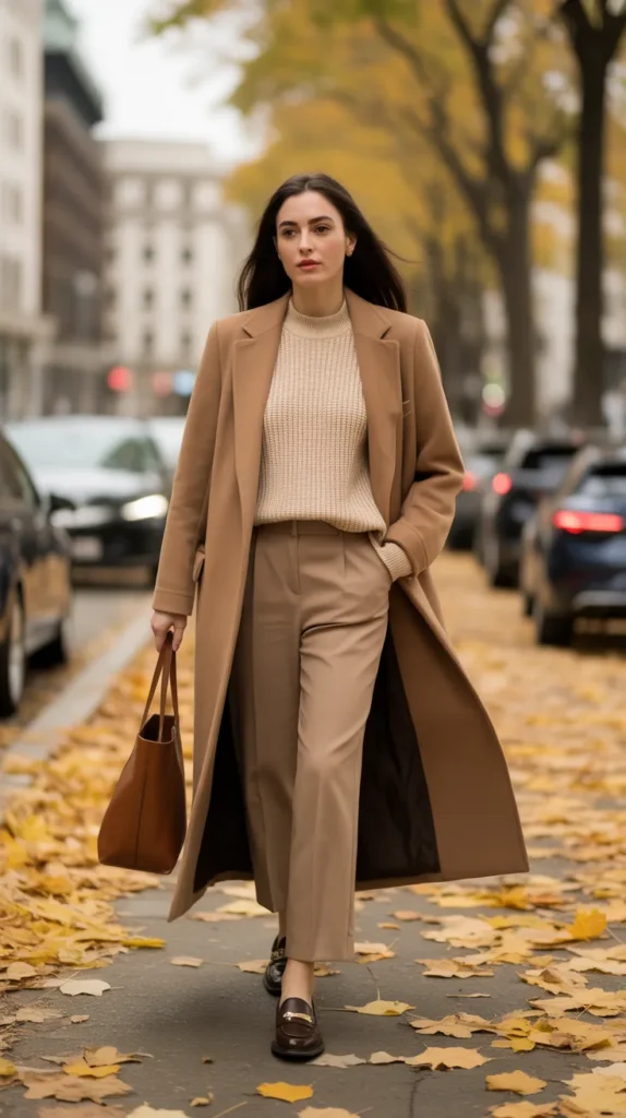 A camel coat is one of those timeless staples that instantly pulls your look together, and when styled over monochrome layers, it feels polished without even trying. Pairing it with a beige knit top and tailored trousers creates a sleek autumn outfit inspo look that works for workdays or weekend brunch. The neutral palette keeps things classy while the loafers add that effortless finish. If you want to switch it up, swap loafers for ankle boots for an even cozier vibe. This is the kind of outfit that makes you feel put-together but not overdressed. Add a leather tote or crossbody to keep it practical. Scarves in muted tones like grey or olive can add texture without overpowering the look. Honestly, this combo is proof that minimal styling can still give you endless cute autumn outfits options. π