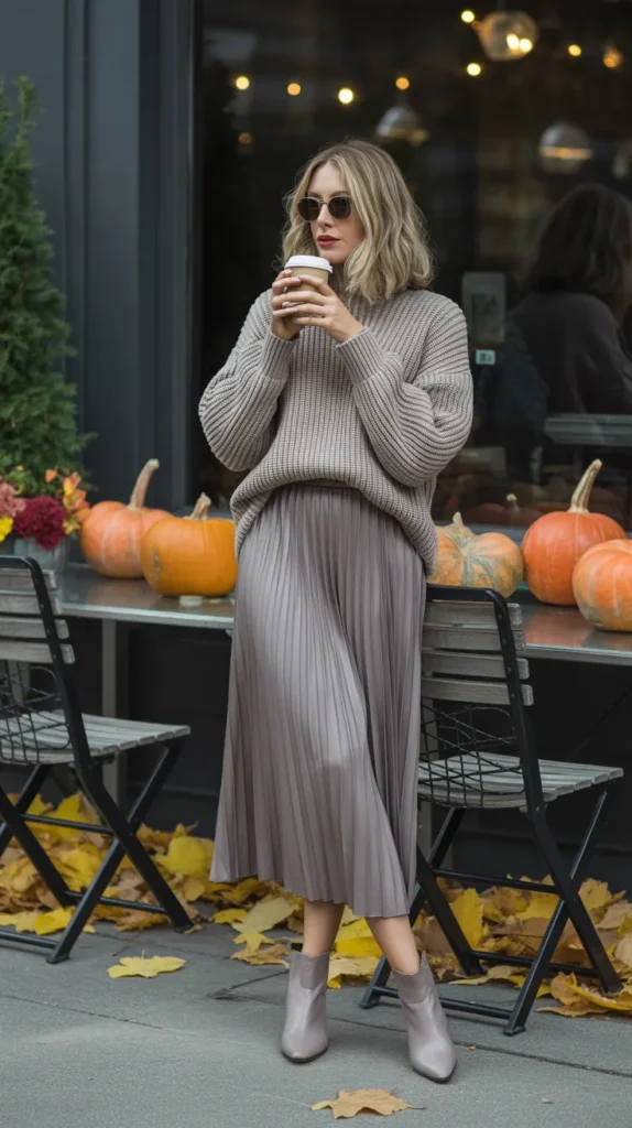 When the weather cools, thereβs nothing better than a chunky knit sweater, especially when styled with a pleated midi skirt. This look brings a mix of cozy and feminine charm, perfect for cute autumn outfits that feel balanced. The sweater tucked slightly into the skirt keeps proportions flattering without losing that relaxed vibe. Ankle boots complete the outfit, making it versatile enough for coffee dates, museum visits, or even a casual office day. Layered necklaces or statement earrings can dress it up without overdoing it. For colder days, just throw on a long coat or a scarf, and youβre ready to go. Itβs one of those looks that makes you feel both comfortable and stylish at the same time. Thatβs why itβs always a favorite for autumn inspo outfits.