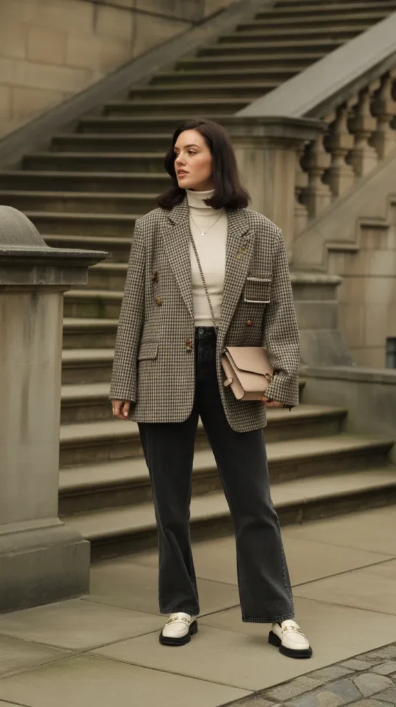 If youβre into that old money aesthetic, a houndstooth tweed blazer is an absolute must-have. Styled over a cream turtleneck with dark denim, this look screams understated sophistication. Loafers keep it classic, while a crossbody bag adds a modern twist. Itβs a perfect autumn outfit for casual Fridays at work, or even just strolling through the city. The textures tweed, knit, and denim play so well together, creating depth without being loud. You could swap the jeans for tailored trousers if you want to lean more business casual. A silk scarf tied around your bag or neck can bring even more polish. This edit is proof that autumn old money outfits donβt need to feel complicated to look chic. π