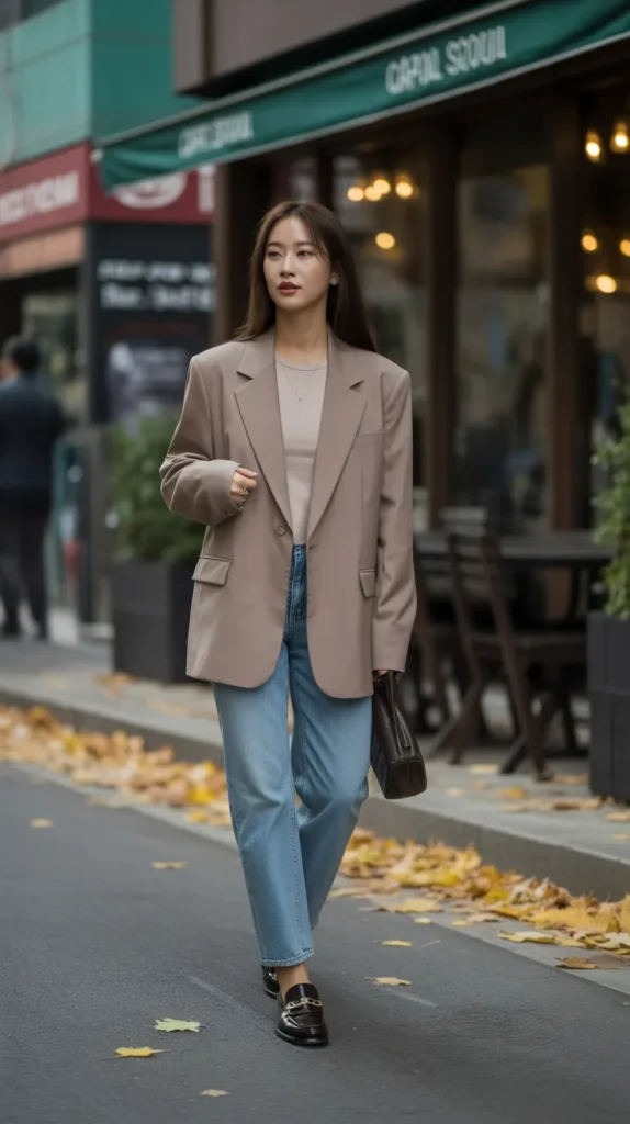When it comes to autumn outfits in Korea, the oversized blazer is basically a staple piece. Pairing a taupe blazer with a simple tee and straight-leg jeans gives you that polished yet casual vibe. Loafers instantly elevate the look, making it perfect for coffee runs or casual meetings. The trick is to keep the color palette neutral taupe, cream, or grey tones always feel timeless. Add a small crossbody bag for practicality without sacrificing style. Want to dress it up? Swap loafers for ankle boots and you’re set. This outfit nails the balance of street style and chic polish. Honestly, it’s the kind of fall Korean fashion look that always works no matter where you’re headed.