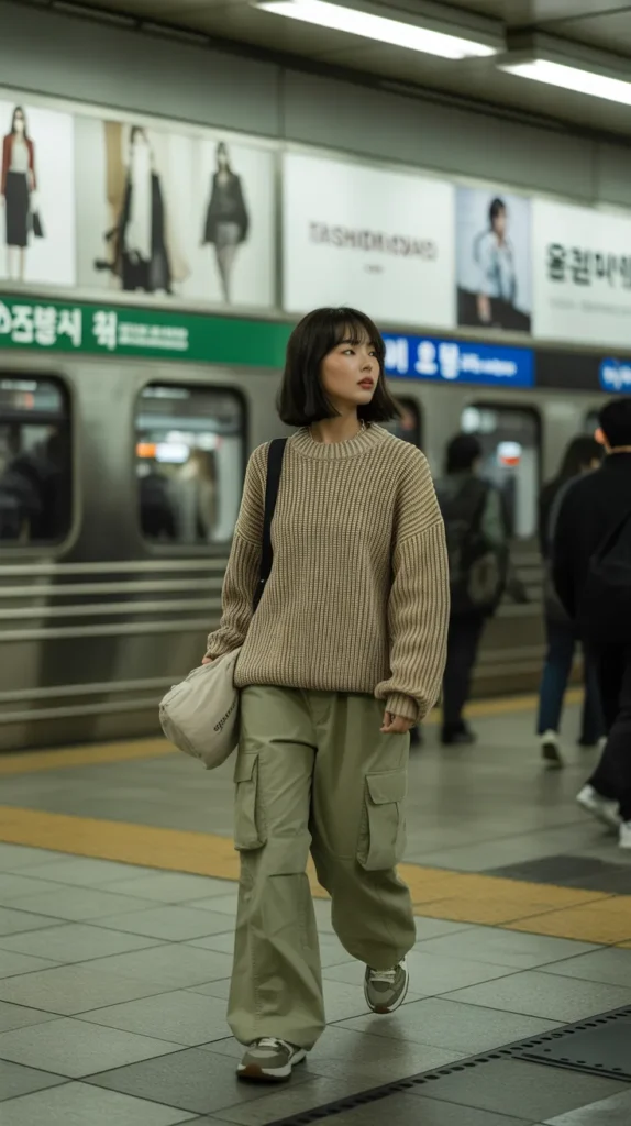 Comfort doesn’t mean boring especially not with cargo pants. Pair them with an oversized beige knit sweater for a cozy yet street-style vibe. Sneakers keep it grounded, while the loose shapes make the outfit super wearable. Add a crossbody or backpack for extra function. This one has that casual autumn outfit feel but still looks on-trend. A beanie or cap can complete the look if you want. Neutral colors keep it chic, but you could always add a pop with sneakers or accessories. This is definitely a Seoul-style everyday look.
