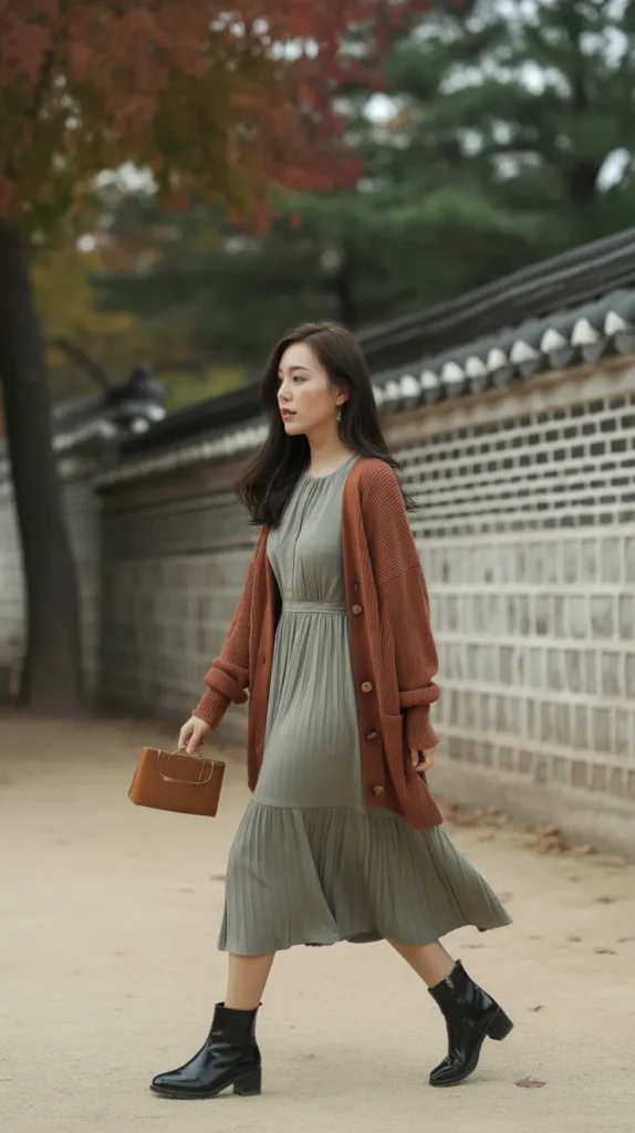 If you’re into softer, modest outfits, a muted olive dress with a rust cardigan is perfect. It’s warm, earthy, and super feminine. Ankle boots add structure while keeping it comfy. This is a great option for weekend strolls, brunch, or even casual workdays. Add a leather belt at the waist if you want definition. The earthy tones make it very deep autumn style, which always looks chic. A scarf or simple jewelry can finish the look beautifully. Honestly, this combo makes effortless elegance look so easy.
