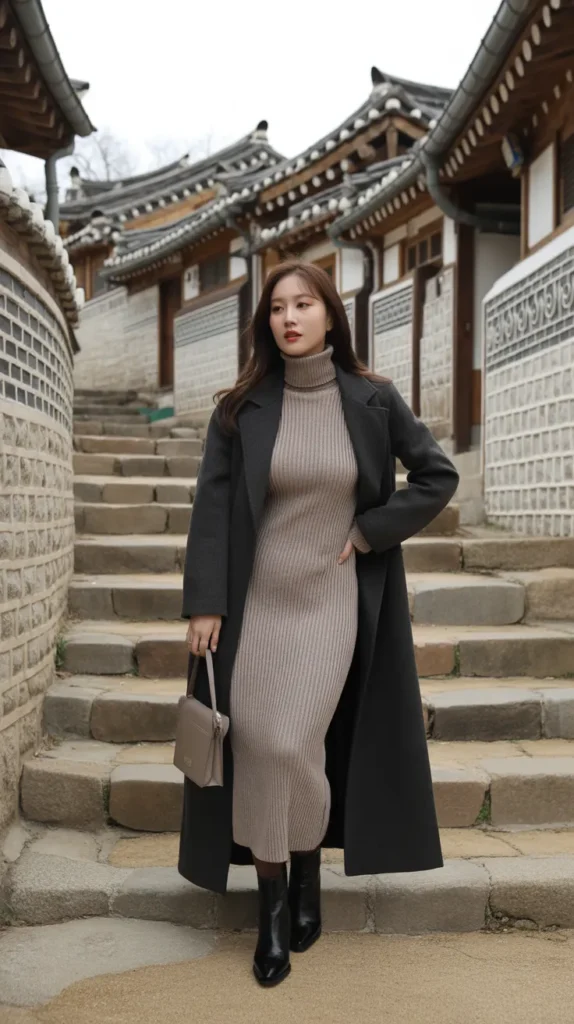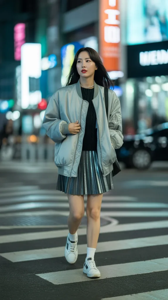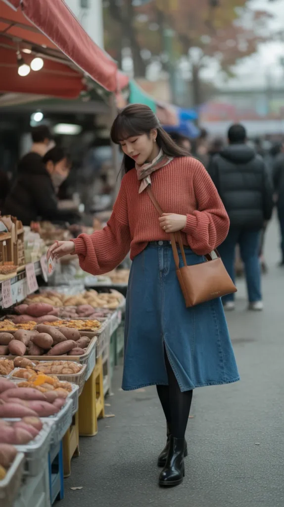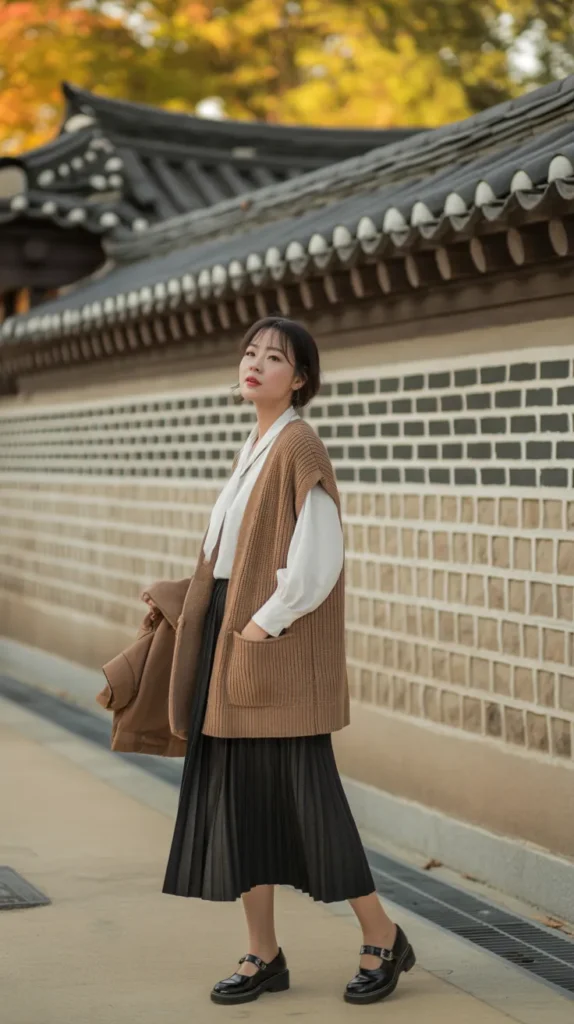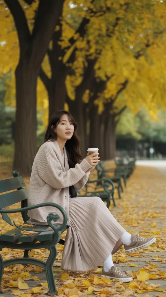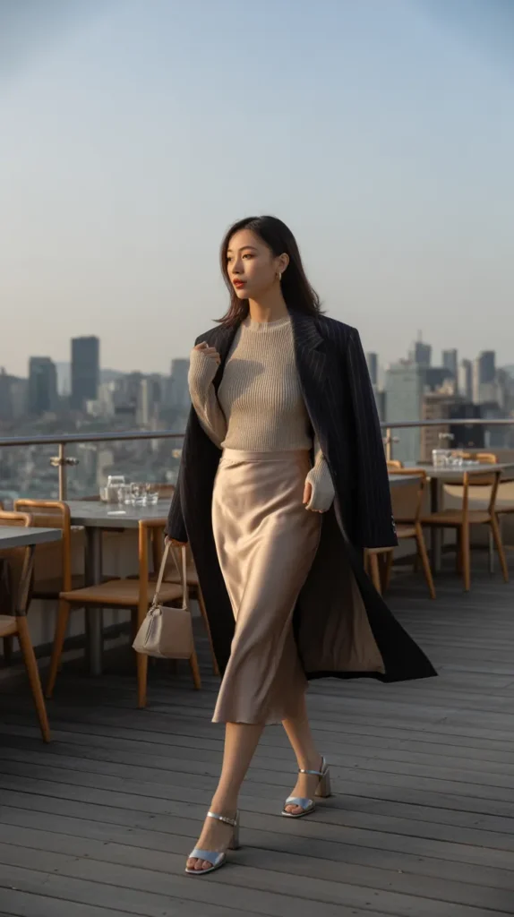 Slip skirts aren’t just for summer they shine in autumn too. Pair a satin slip skirt with a long blazer for a mix of soft and structured. A fitted knit tucked in balances the proportions. Block heels make it dressy but still wearable. This is a great dinner date or semi-formal event look. Neutral or jewel tones make it seasonal. Add minimal jewelry for polish. It’s one of those chic autumn outfits in Korea that always feel elegant but easy.