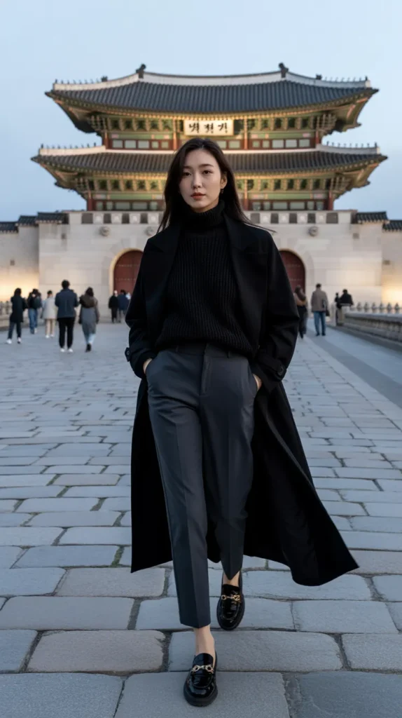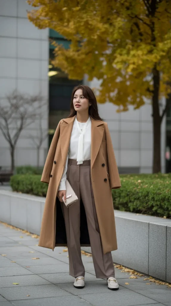 A camel double-breasted coat is the definition of fall Korean fashion. Pair it with tailored slacks and a white blouse for instant sophistication. Loafers tie it together without feeling too formal. This is the kind of outfit that transitions easily from office to dinner. Add a leather tote or crossbody for structure. Neutral tones make it timeless and versatile. This is definitely one of those autumn outfits in Korea you’ll see on city sidewalks everywhere. It’s minimal but oh-so-chic.