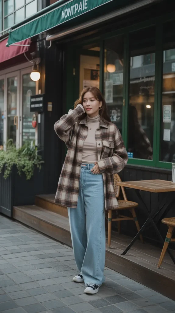 Plaid overshirts are casual staples, but styling them with wide-leg jeans makes them feel modern. Layer it over a fitted turtleneck for warmth and balance. Sneakers keep it relaxed but still fashionable. This is the kind of autumn inspo outfit you’d wear to a café or a casual day out. Accessories like a beanie or tote bag complete the vibe. The wide-leg jeans give it that retro feel, which is trending hard in Korea. It’s comfy, easy, and stylish without overthinking. Honestly, it’s fall fashion at its simplest.