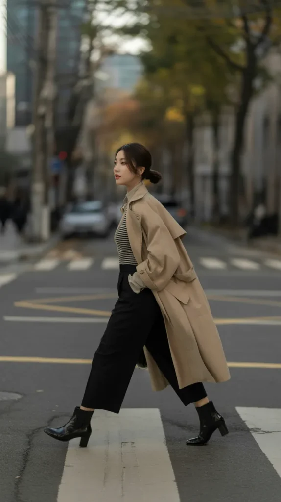 Nothing screams fall Korean fashion like a beige trench coat. It’s versatile, timeless, and goes with literally everything. Layer it over a striped knit and cropped trousers for a modern twist on a classic outfit. Ankle boots keep things grounded and chic at the same time. The cropped trousers give just enough ankle peek to balance the coat’s long lines. Add a crossbody or structured tote and you’re ready for both work and weekend strolls. This combo is especially great for transitional weather when it’s cool but not freezing. Neutral tones help the trench stay the hero piece. Honestly, trench coats are the definition of autumn outfits in Korea.