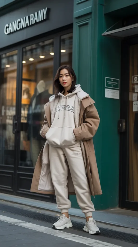 Monochrome outfits always look classy, and in cream tones they feel extra chic. A fleece-lined hoodie and joggers bring the cozy vibes, while an oversized coat sharpens the look. Chunky sneakers add that youthful, autumn inspo outfit energy. To keep it from feeling too plain, play with textures fleece, wool, and even a leather crossbody bag. It’s casual, yes, but it also looks like you thought about your outfit. Sunglasses or a baseball cap can make it even cooler. Honestly, this outfit feels straight out of Seoul streetwear trends. It’s a casual outfit that proves comfort doesn’t mean sloppy.