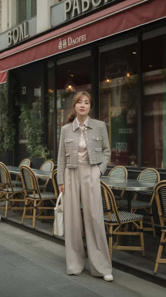 A tweed jacket is basically an instant elevation piece. Layer it over a collared blouse with wide-leg trousers and you’ve got a modest outfit that feels Parisian chic. The cropped cut keeps it youthful, while the tweed adds structure. Block heels or loafers are perfect here. Add simple gold jewelry and a crossbody to polish the look. This one screams classy but not try-hard. It’s the kind of outfit you could wear to work, a dinner, or just strolling around the city. Tweed in autumn always feels right. Honestly, this one defines mode casual elegance.