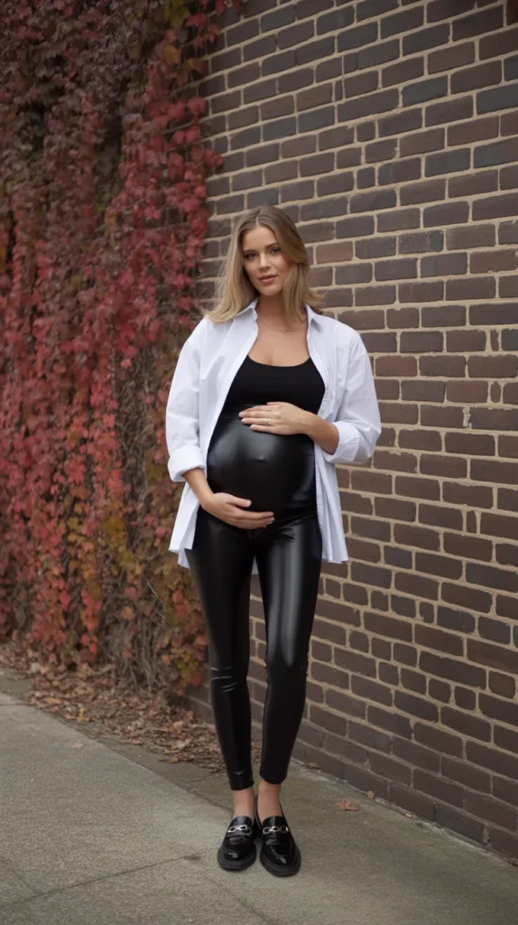Black faux-leather maternity leggings are edgy yet comfy. Pair them with an oversized white shirt and loafers for a polished look that feels bold. These kinds of autumn outfits remind us that pregnancy fashion can have a little edge, too.