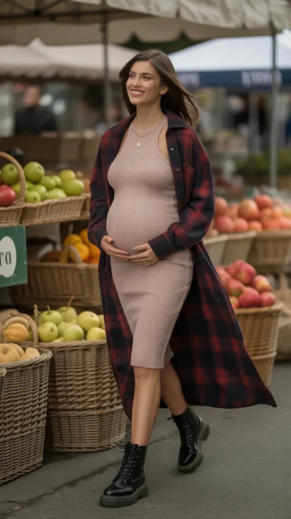 A fitted ribbed maternity dress styled under a plaid shacket is the definition of cool-girl fall style. Combat boots complete the look, creating one of the most trendy maternity outfits for crisp autumn days.