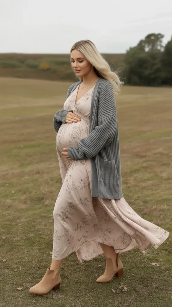 Floral maxi dresses never go out of style, especially when styled with a chunky cardigan and suede boots. This relaxed look embodies chic pregnancy style while giving off effortless boho vibes perfect for outdoor gatherings or casual weekends.