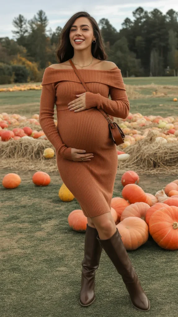 A burnt orange off-shoulder maternity sweater dress paired with tall boots is a bold, confident option. It hugs your shape in all the right places while still keeping you cozy. A stunning pick for showcasing chic pregnancy style with ease.