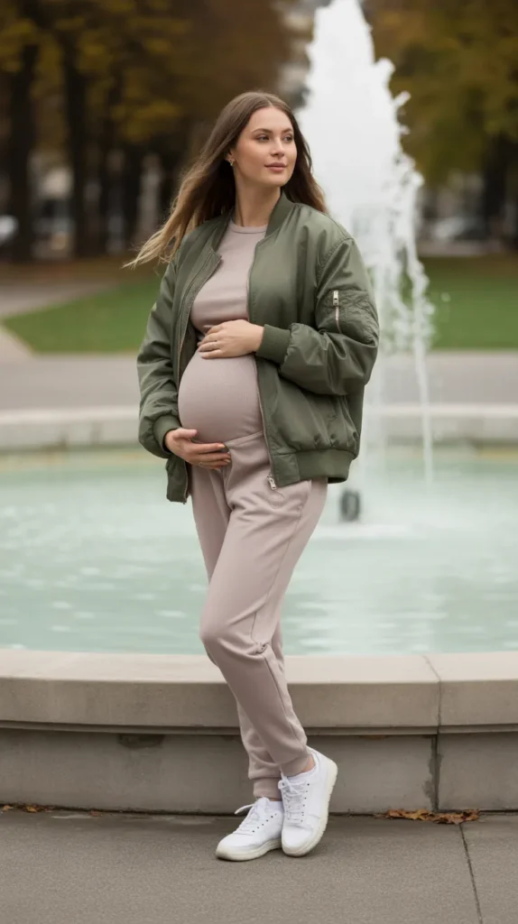 For those days when you just want comfort without giving up on style, maternity joggers with a long-sleeve tee and bomber jacket work wonders. Sneakers finish the look, making this a casual yet modern Schwanger Herbst Outfit idea.
