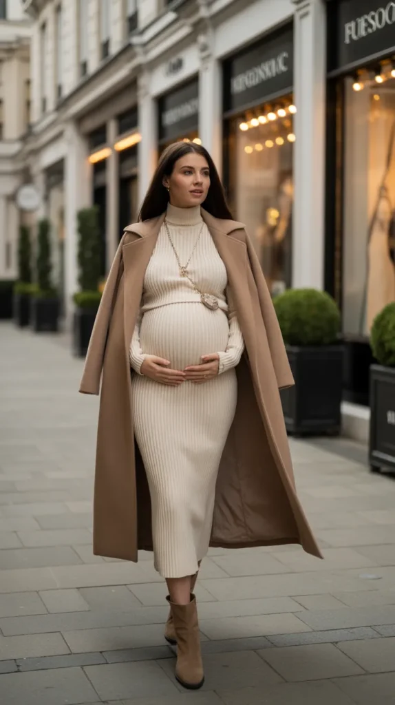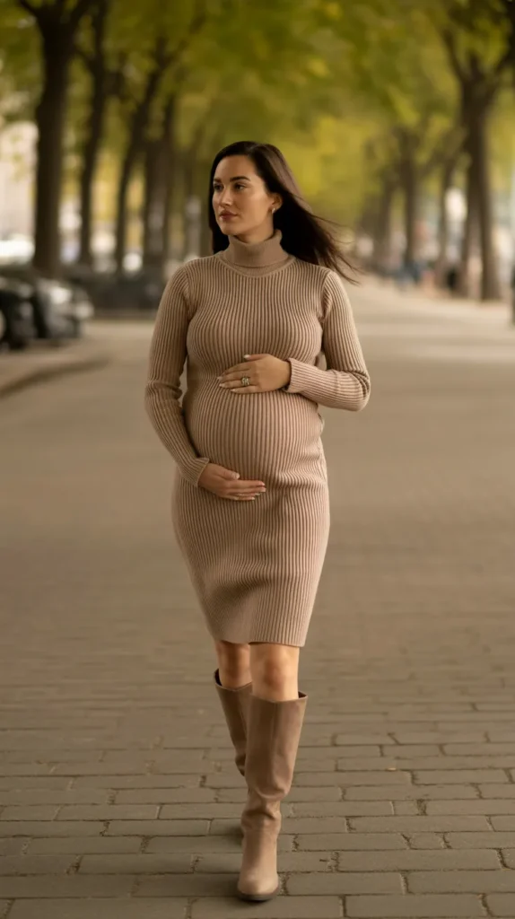 A ribbed camel maternity sweater dress styled with tall boots is effortlessly elegant. This is one of those chic pregnancy style staples that flatters your shape while still keeping you warm. You can throw on a trench coat or scarf for extra layers without losing the sleek vibe.