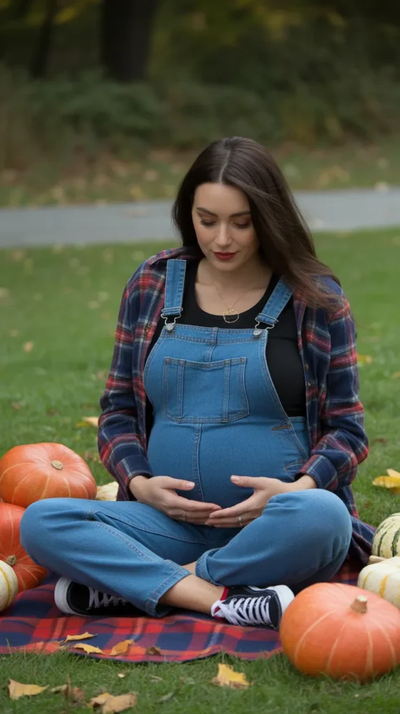 Denim overalls are a fun, playful choice and when paired with a plaid shirt, they become a cozy weekend go-to. Finish the look with sneakers for a casual vibe. This outfit screams Schwanger Herbst Outfit inspiration, perfect for pumpkin patch visits or farmer’s markets.