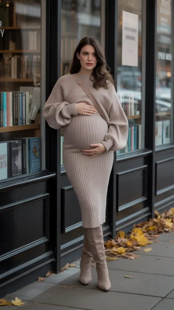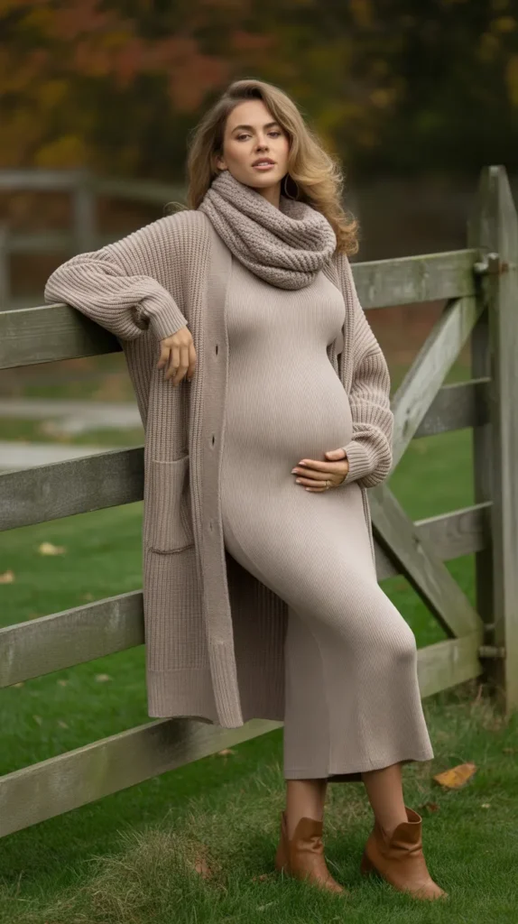 Stretchy bodycon dresses are a bump’s best friend, and they look even better when layered with a chunky cardigan. Add a scarf and boots to complete the vibe. This mix of polished and sexy proves that pregnancy fashion autumn doesn’t have to be complicated to feel stylish.