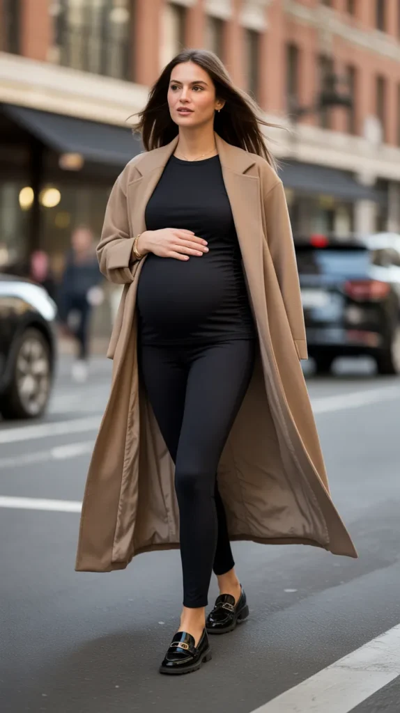 Black maternity leggings are a fall essential, especially when styled under a longline coat. Add a fitted tee underneath and loafers for that sleek finish. It’s the type of look that blends trendy maternity outfits with easy movement.