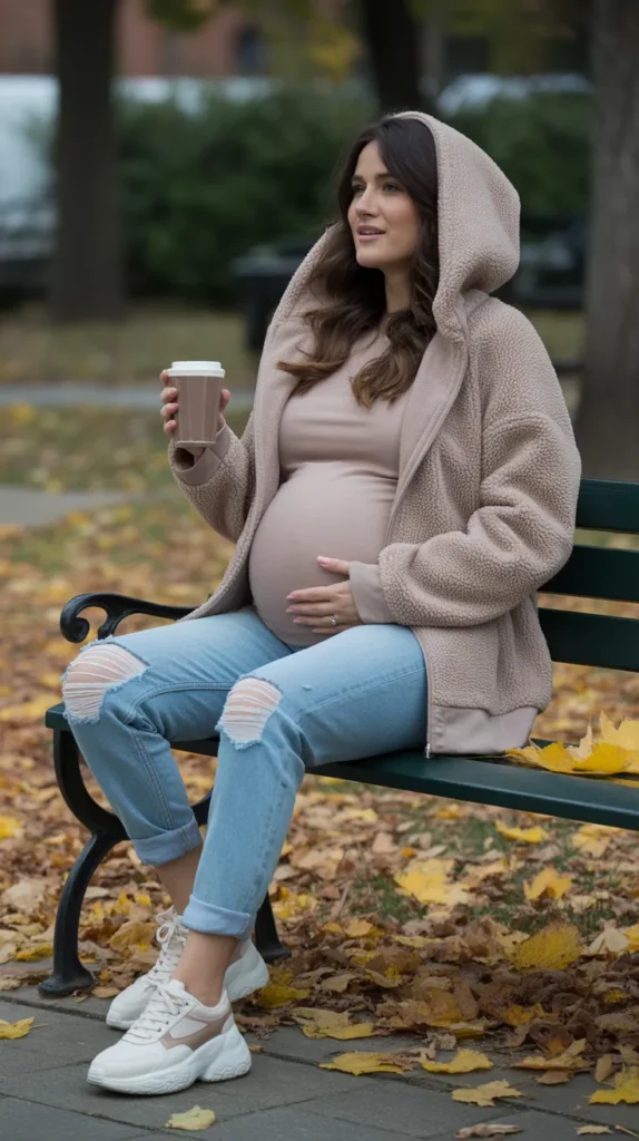 For laid-back days, a fleece-lined maternity hoodie with distressed jeans is unbeatable. Chunky sneakers keep it modern while staying comfy. This is a go-to look for pregnancy fashion autumn when casual comfort meets street style.