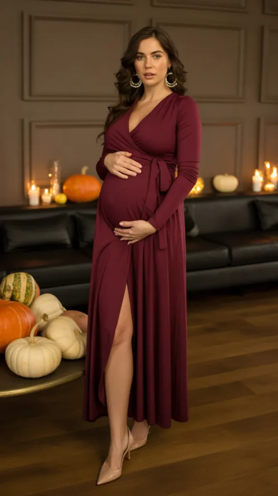 A burgundy maternity wrap dress adds instant glam while still being comfortable. Pair it with heels and bold earrings for a date night or special occasion. This outfit proves chic pregnancy style can be sexy, elegant, and practical all at once.