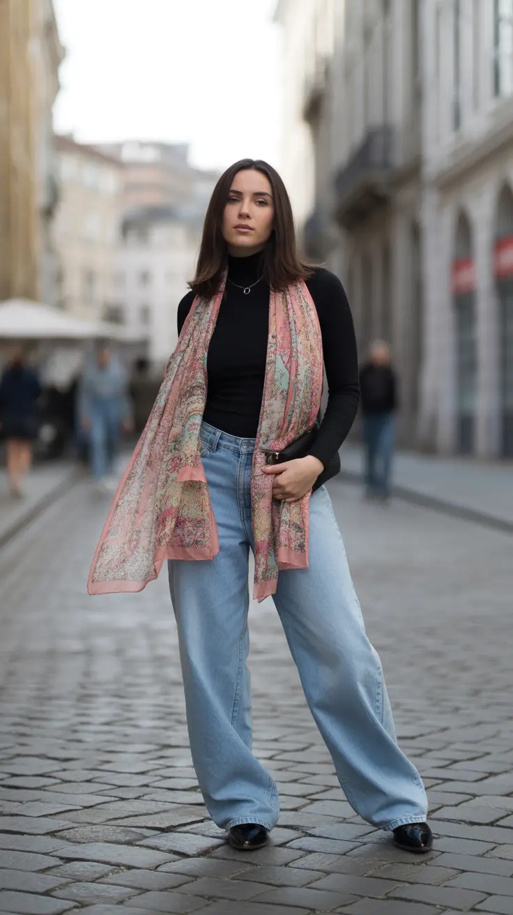 For a trendy outfit, consider choosing a scarf that complements your jeans and top. This outfit inspo is ideal for brunch dates or casual outings with friends. The combination of the scarf and baggy jeans creates a laid-back yet put-together look that’s perfect for any occasion.