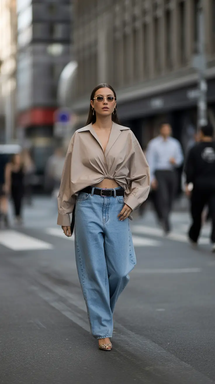 Accessorizing with sunglasses and sleek shoes enhances the overall look, making it a go-to choice for street style enthusiasts. Whether you’re running errands or meeting friends, this relaxed denim look is both chic and functional.