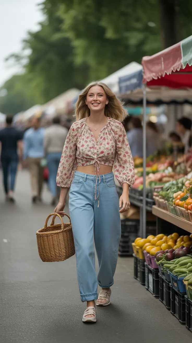 The soft floral patterns on the blouse add a touch of femininity, while the relaxed fit of the baggy jeans keeps things laid-back. This look is all about easy-going vibes, perfect for those who want to feel chic without the fuss.