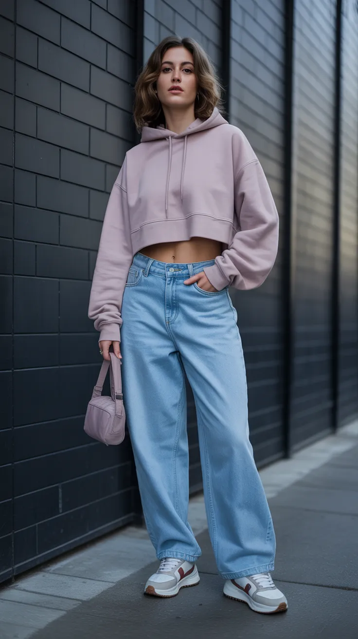 A cropped hoodie paired with baggy jeans creates a cool, laid-back vibe. The retro sneakers add a fun touch, making this outfit perfect for casual outings. This baggy jeans outfit is a great way to stay comfy while looking stylish!