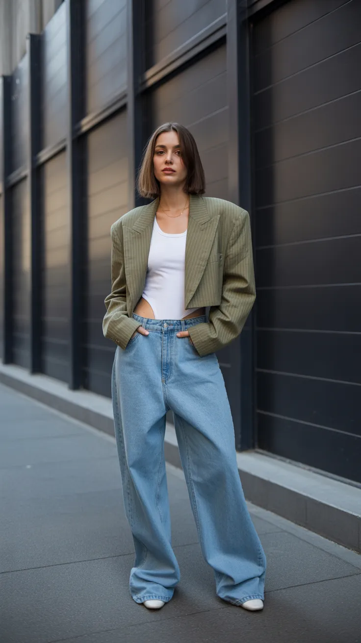 10. Baggy Jeans Look With Cropped Blazer And Bodysuit