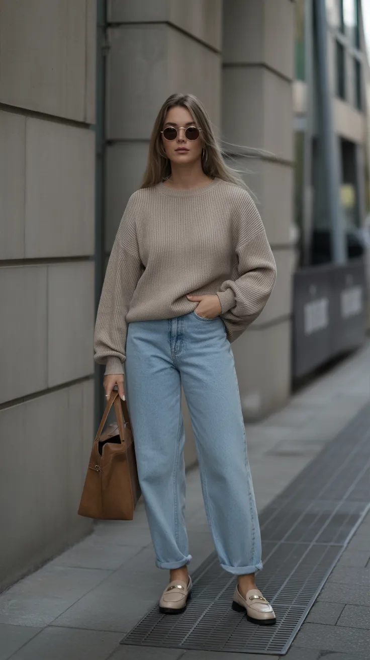 This look is perfect for a casual day out. The combination of baggy jeans and a cozy neutral sweater creates a relaxed vibe that’s both stylish and comfy. Pairing it with loafers adds a touch of sophistication, making it a great choice for any occasion.
