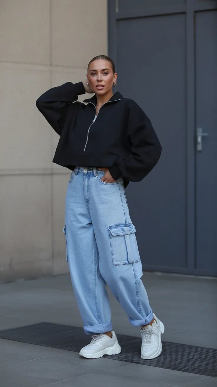 This look combines comfort and style effortlessly. The sporty zip-up jacket pairs perfectly with baggy jeans, creating a laid-back vibe. Chunky sneakers complete the outfit, making it a go-to for casual outings or running errands.