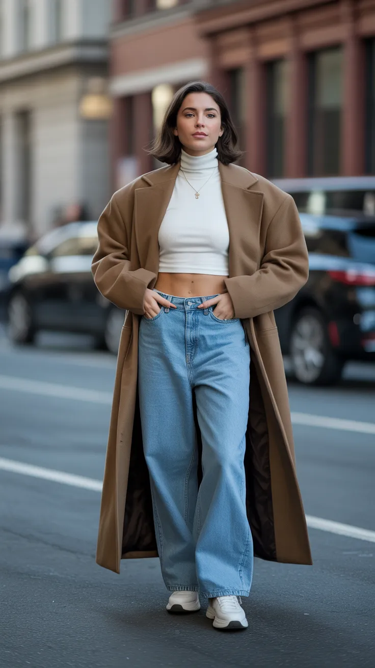 This look combines a long coat with a cropped turtleneck for a chic vibe. Pairing it with baggy jeans creates a relaxed yet stylish outfit. It’s perfect for those who love baggy fits and want to stay comfy while looking trendy.