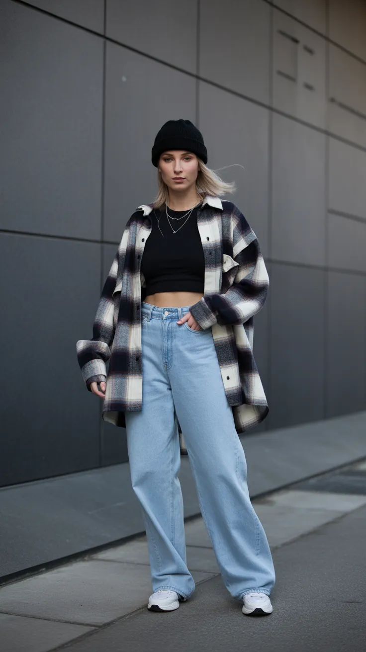 16. Baggy Jeans Outfit With Oversized Flannel And Beanie