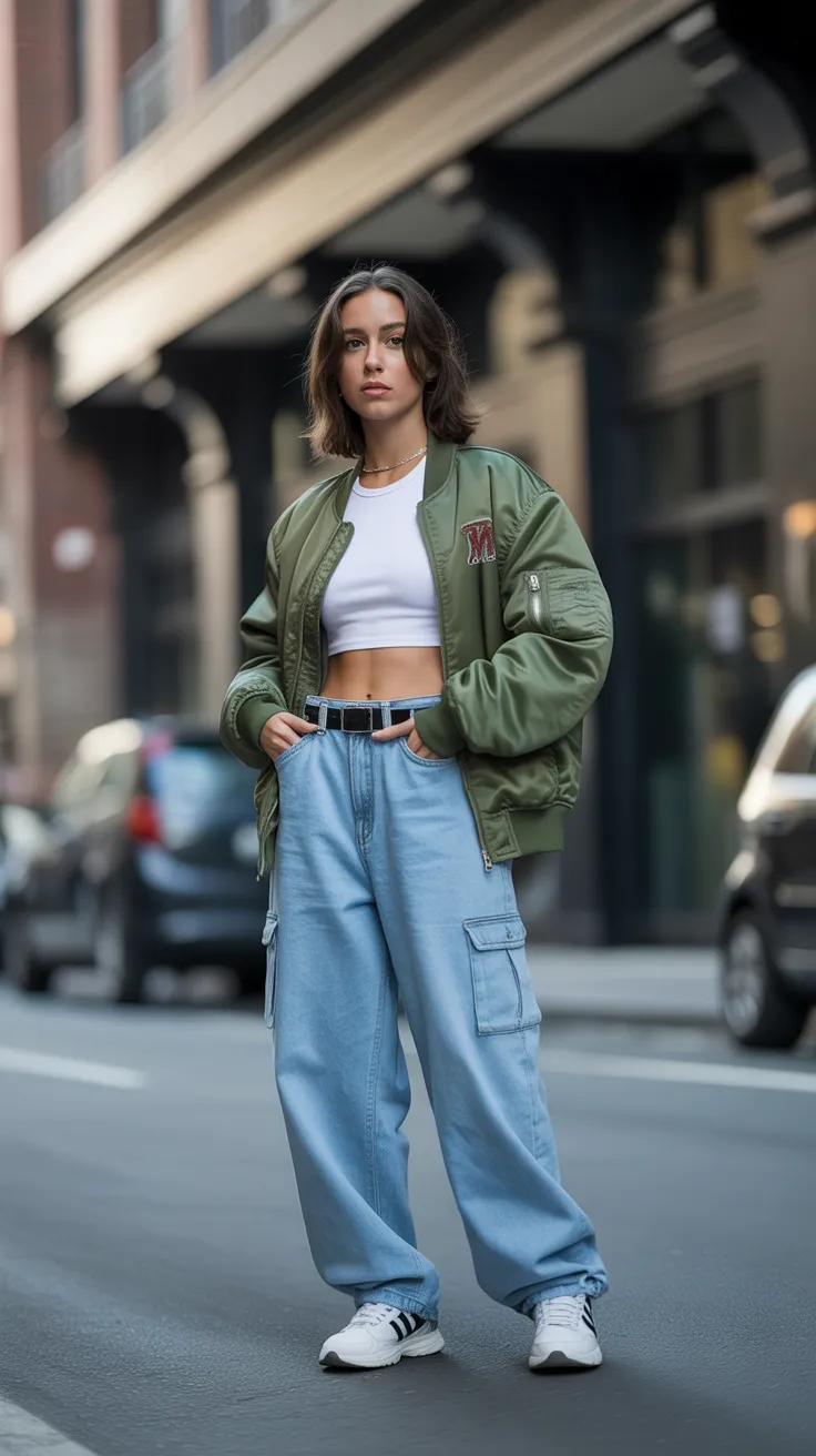 18. Baggy Jeans Look With Crop Top And Bomber Jacket