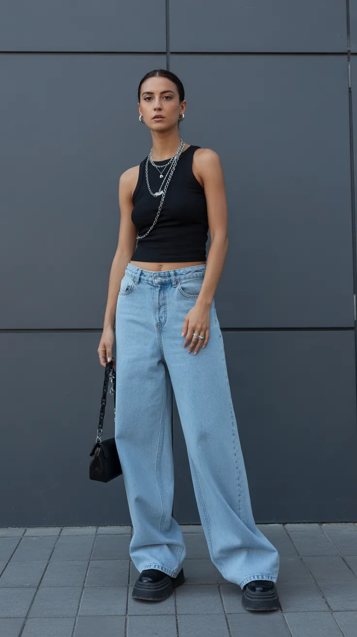 2. Baggy Jeans With Fitted Tank Top And Layered Chains