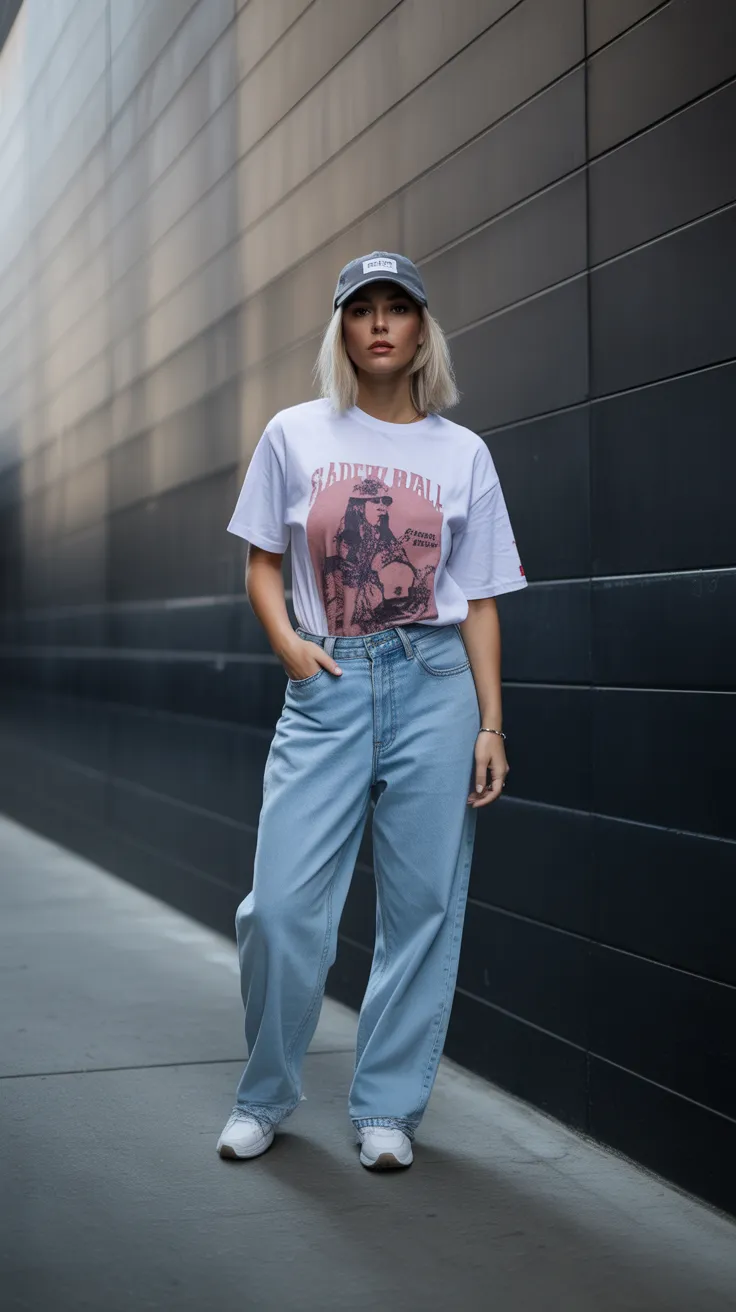 4. Baggy Jeans With Graphic Tee And Baseball Cap