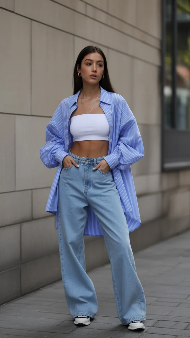 This look combines a tube top with an oversized button-up for a stylish vibe. The baggy jeans outfit keeps things comfy while looking effortlessly chic. It’s a perfect way to rock baggy fits while staying trendy and relaxed!