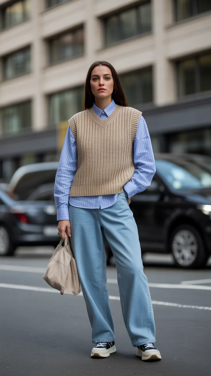 Baggy jeans are a fun way to stay comfy while looking stylish. Pairing them with a knit vest adds a cozy touch, making it perfect for casual outings. Finish the look with some trendy sneakers for that effortless vibe.