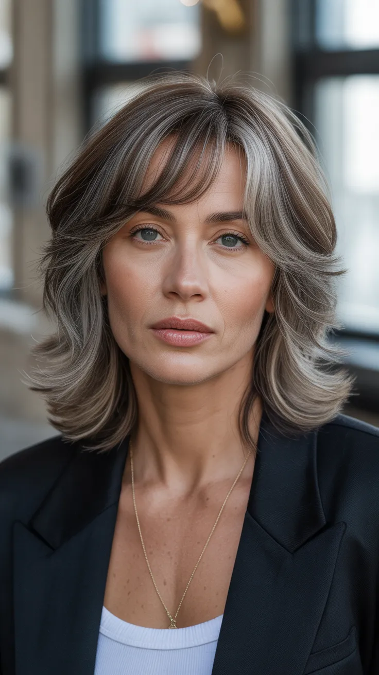 The layers add movement and texture, making it easy to style. This cut is versatile, allowing for various styling options, from sleek and polished to tousled and casual. Long bangs can also help soften features, making them a popular choice in hairstyles for older women.