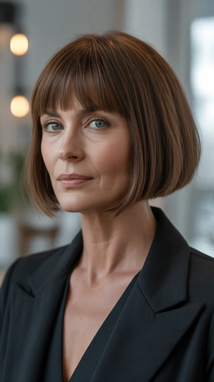 Classic straight bangs paired with a sleek bob create a timeless look that suits women of all ages. This hairstyle is particularly flattering for older women, as it frames the face beautifully and adds a youthful touch. The straight bangs soften the forehead and draw attention to the eyes, making them a great choice for those looking to enhance their features.