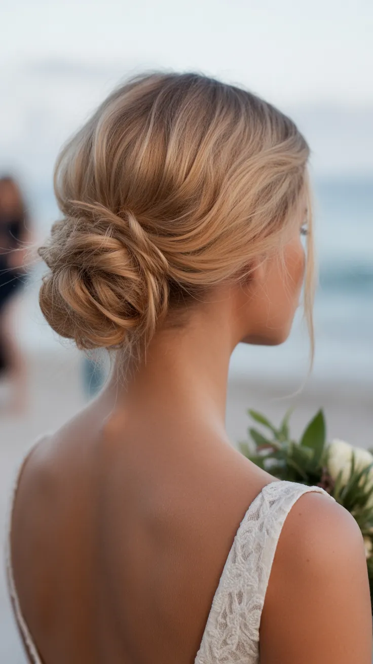 For those considering an updo for a beach wedding, this look is breeze-proof and chic. It keeps hair off the neck while allowing for a few loose strands to softly cascade. Adding floral accents can elevate the style, making it even more enchanting.