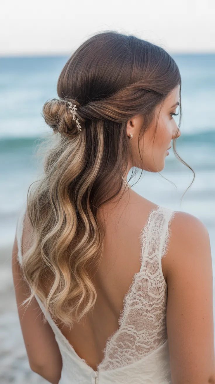 The half-up style keeps hair away from the face while allowing the waves to flow freely. It’s a great choice for brides who want a beachy updo that feels effortless yet chic. Pairing this hairstyle with a floral halo can enhance the romantic feel, making it a standout choice for beach wedding hairstyles.