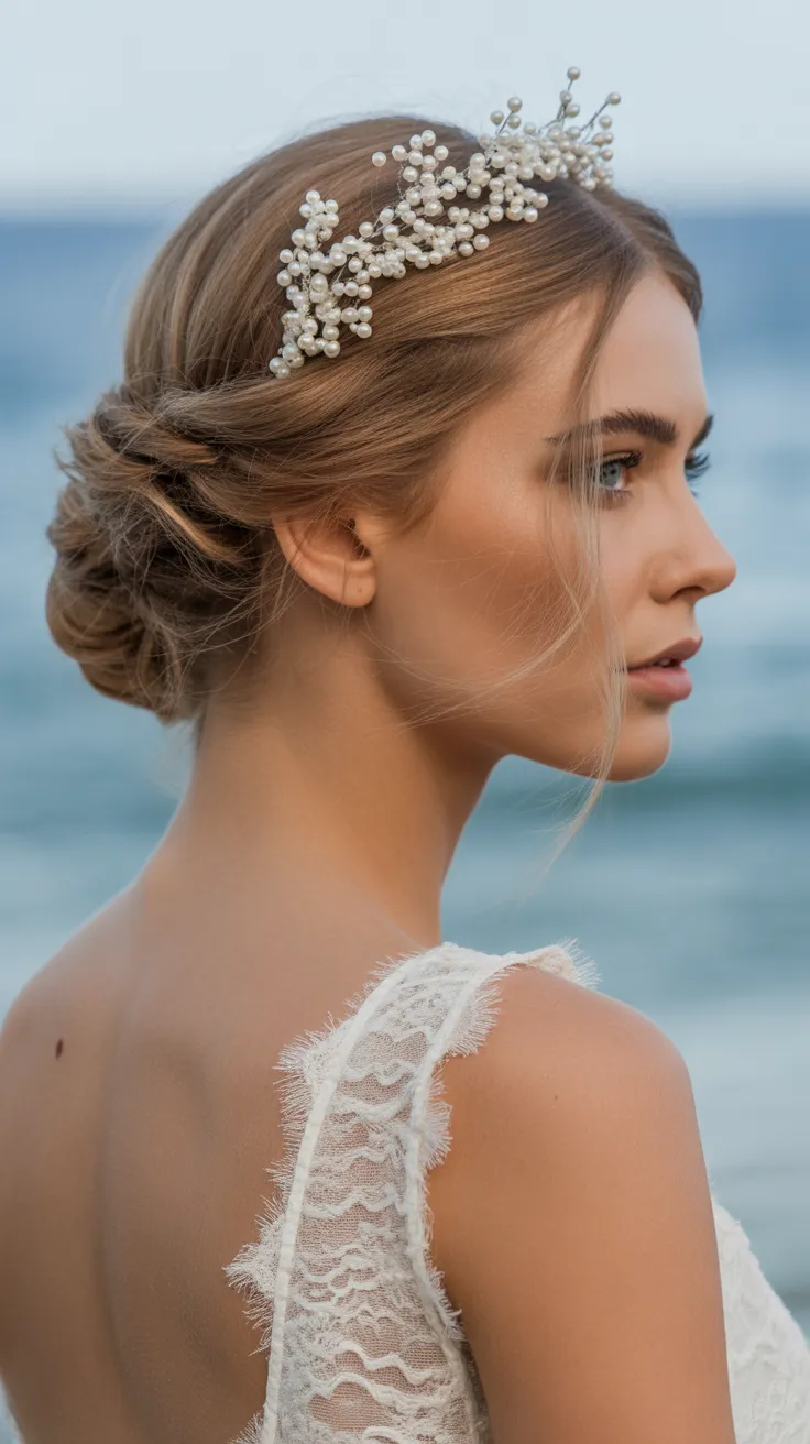 For brides looking for beach wedding hairstyles that are both effortless and chic, the twisted crown with sea pearl details is a fantastic option. It’s a perfect blend of beauty and functionality, making it a go-to choice for any beach wedding.